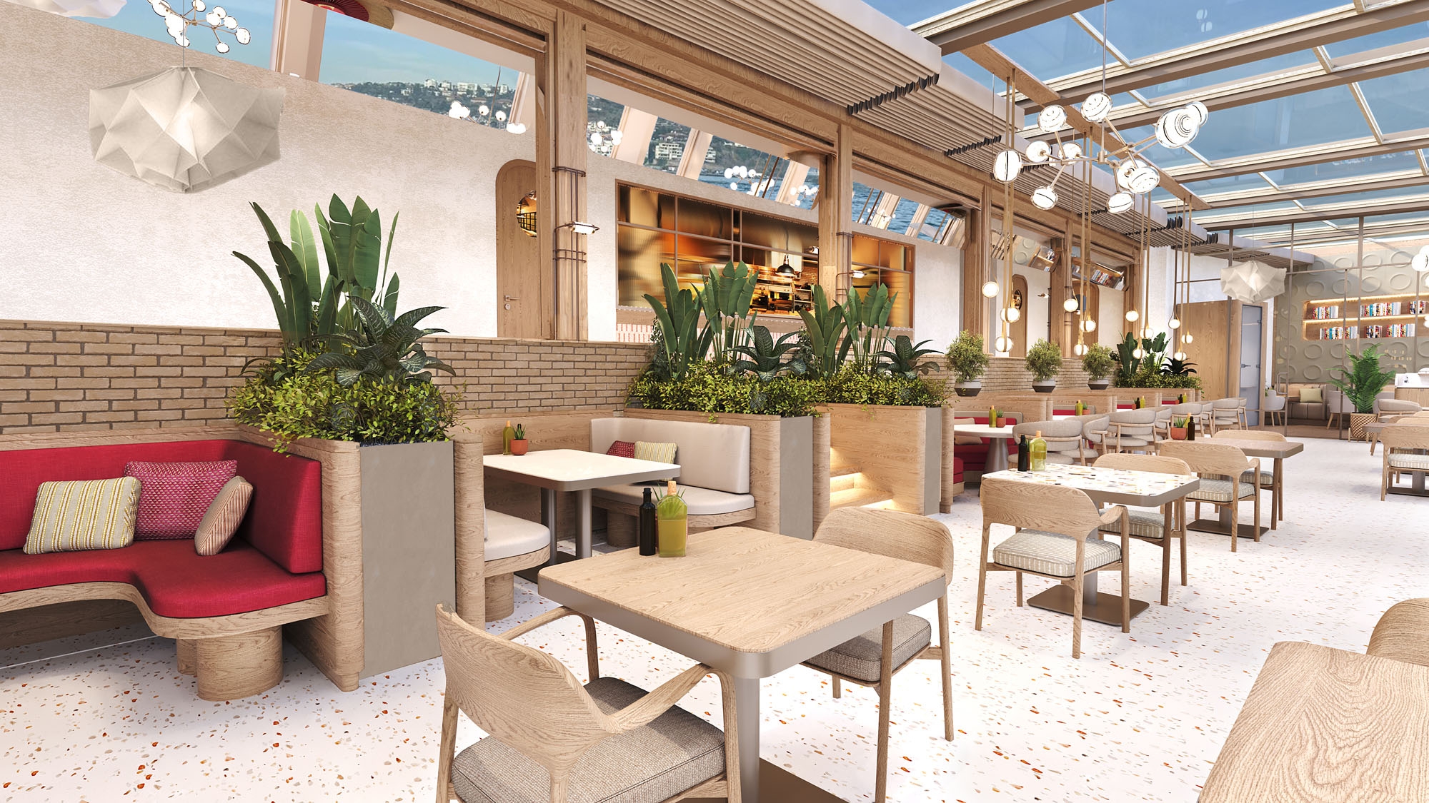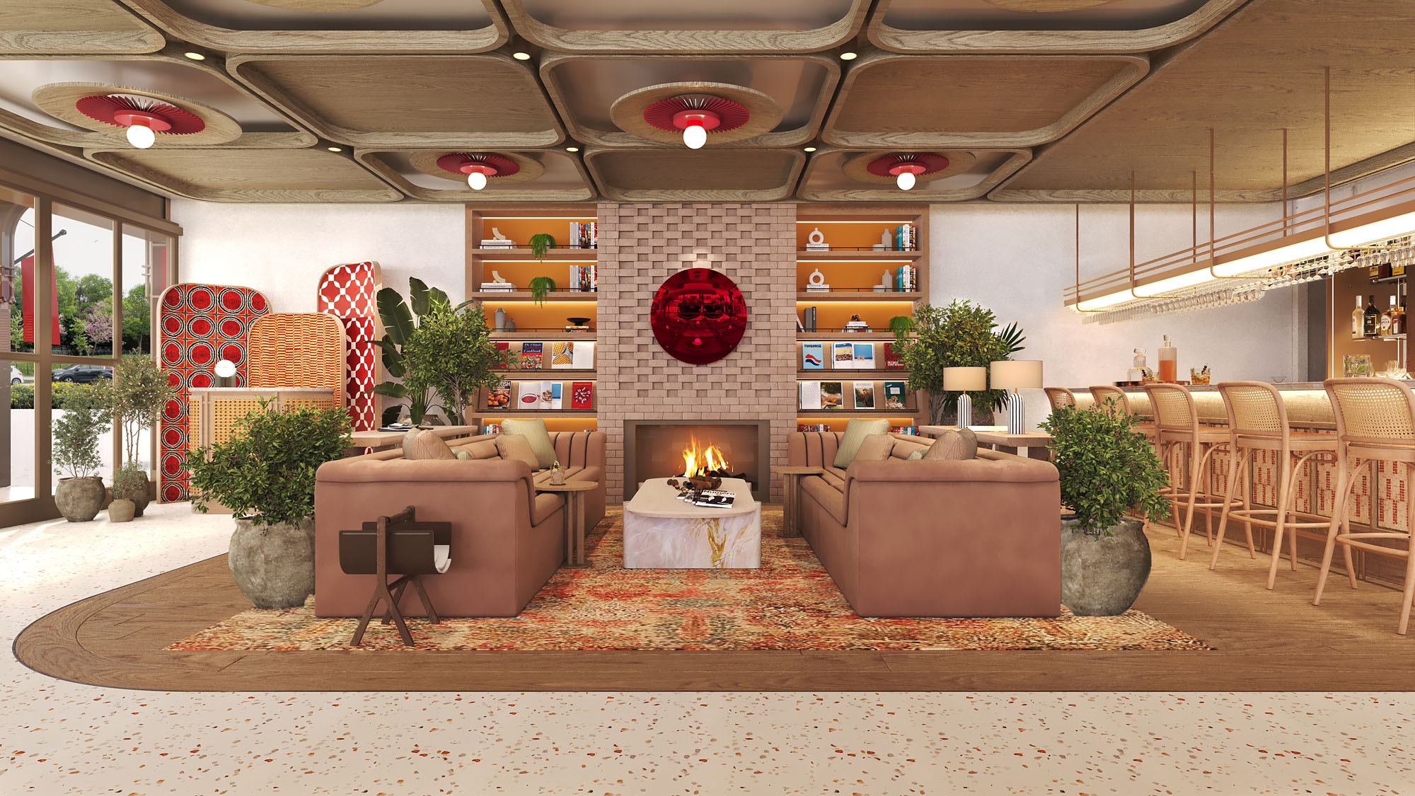 Inside, natural materials such as wood and terrazzo define the space, complemented by warm red tones that add a sense of modern elegance and energy. The fine craftsmanship of the wooden elements enhances the sense of warmth and authenticity, while terrazzo surfaces introduce contemporary sophistication. Big Chefs’ signature red palette reinforces the dynamic character of the interior, while brick details contribute an industrial yet historically rooted aesthetic.