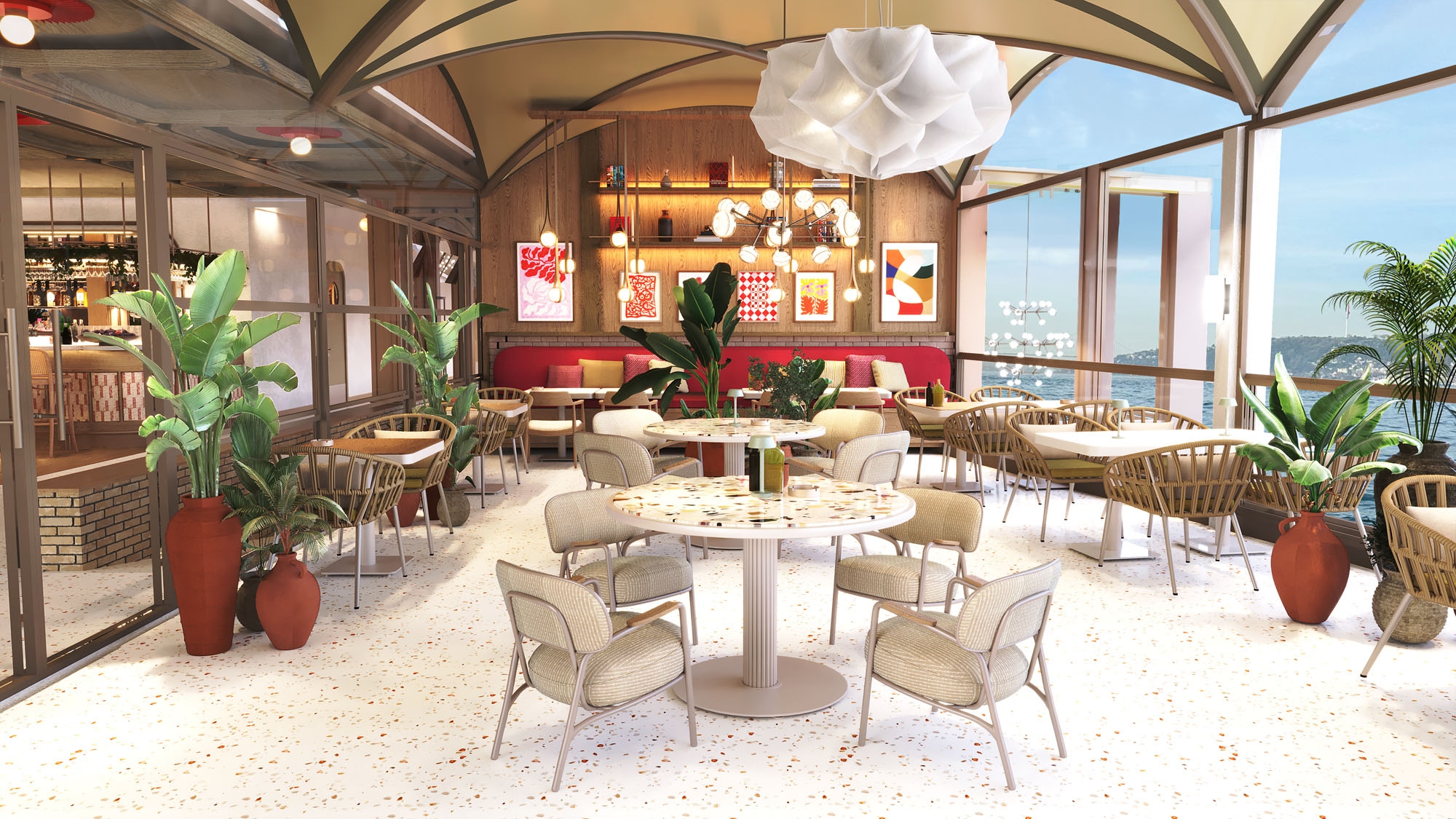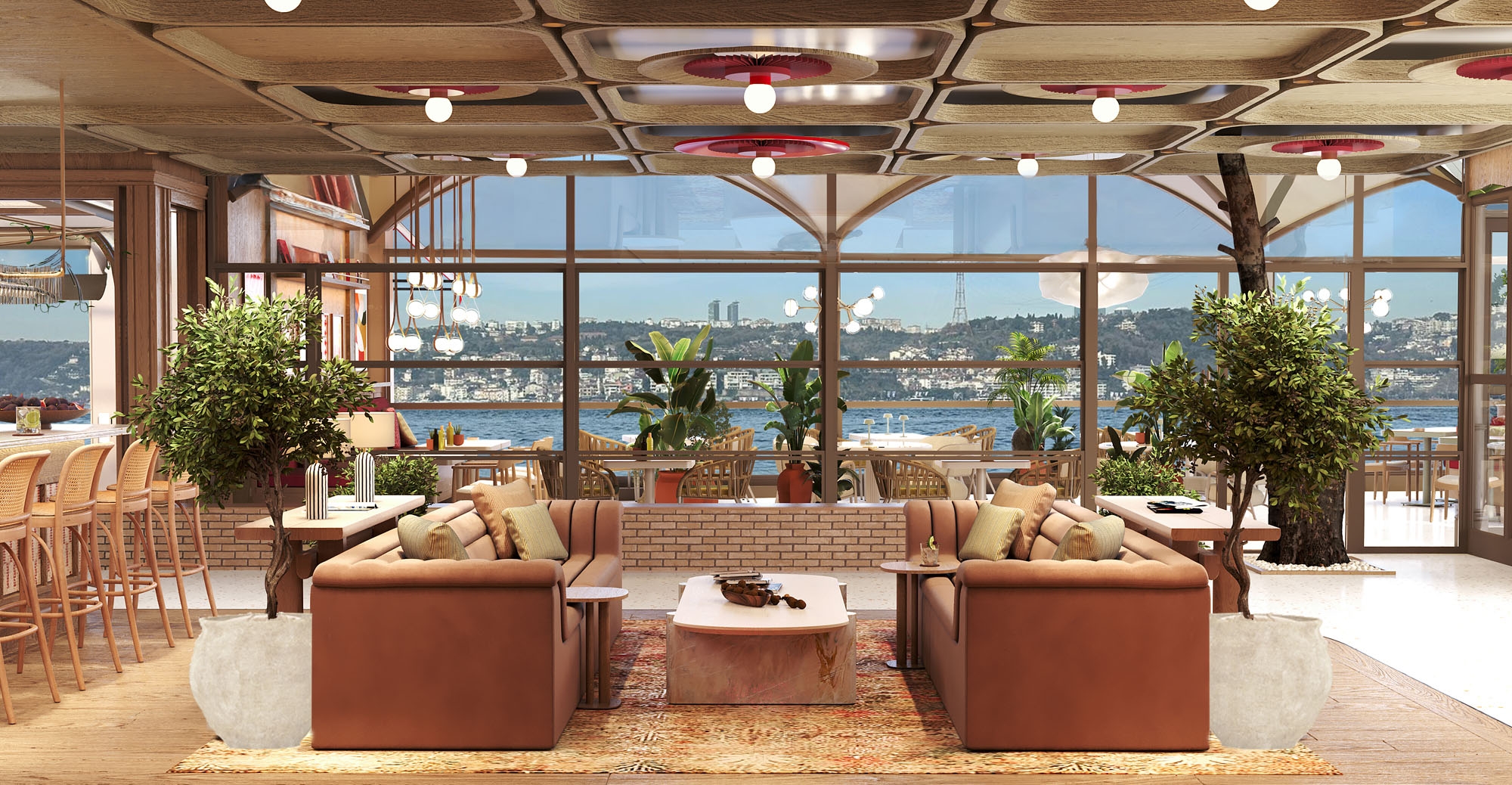 The terrace area is designed to provide a tranquil setting with panoramic views of the Bosphorus. Comfortable seating and dining areas cater to both individual and group gatherings, ensuring a memorable atmosphere that enhances the overall experience.