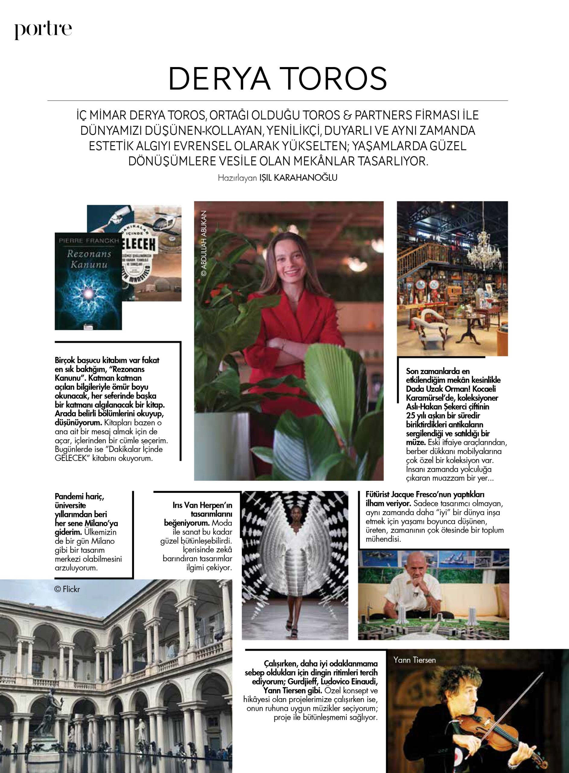 Derya Toros recently gave an interview for the portrait section of Marie Claire Maison magazine. At Toros and Partners, she shared how the firm blends design, technology, and innovation to create transformative spaces. With pioneering projects like Backyard Workhub in the Metaverse, they are redefining the way we work and live in the digital age.
