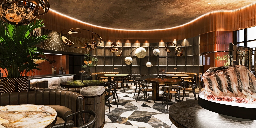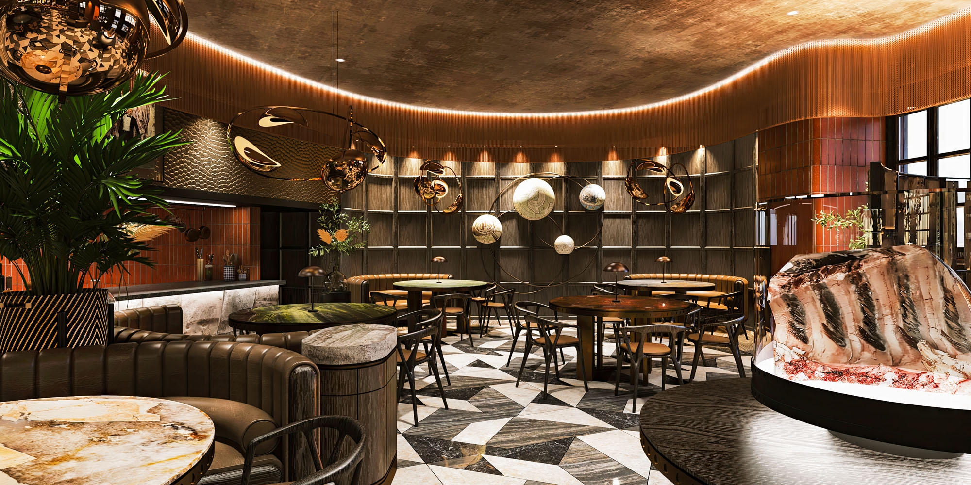 Mekan tasarımı, et ustalığının özünü mekansal bir deneyime dönüştürmeyi hedeflemiştir. Doğal taş yüzeyler, el oyma ahşap paneller ve metal detaylar; güç, ustalık ve rafinelik kavramlarını dengeli bir kompozisyon içinde bir araya getirmiştir. Bu malzeme paleti, modern çizgilerle bütünleşerek zamansız ve güçlü bir steakhouse atmosferi oluşturmuştur.