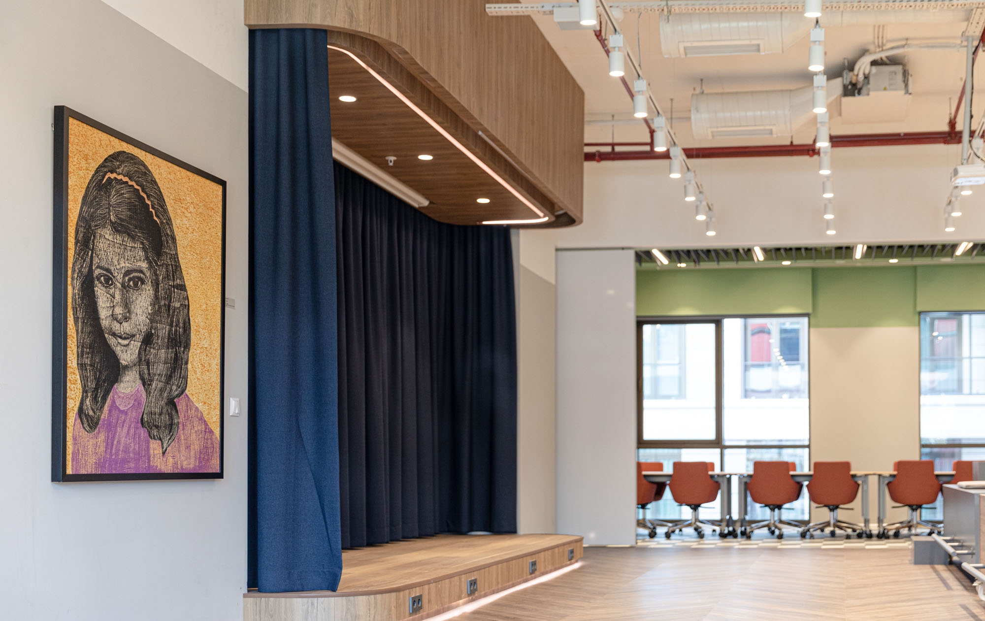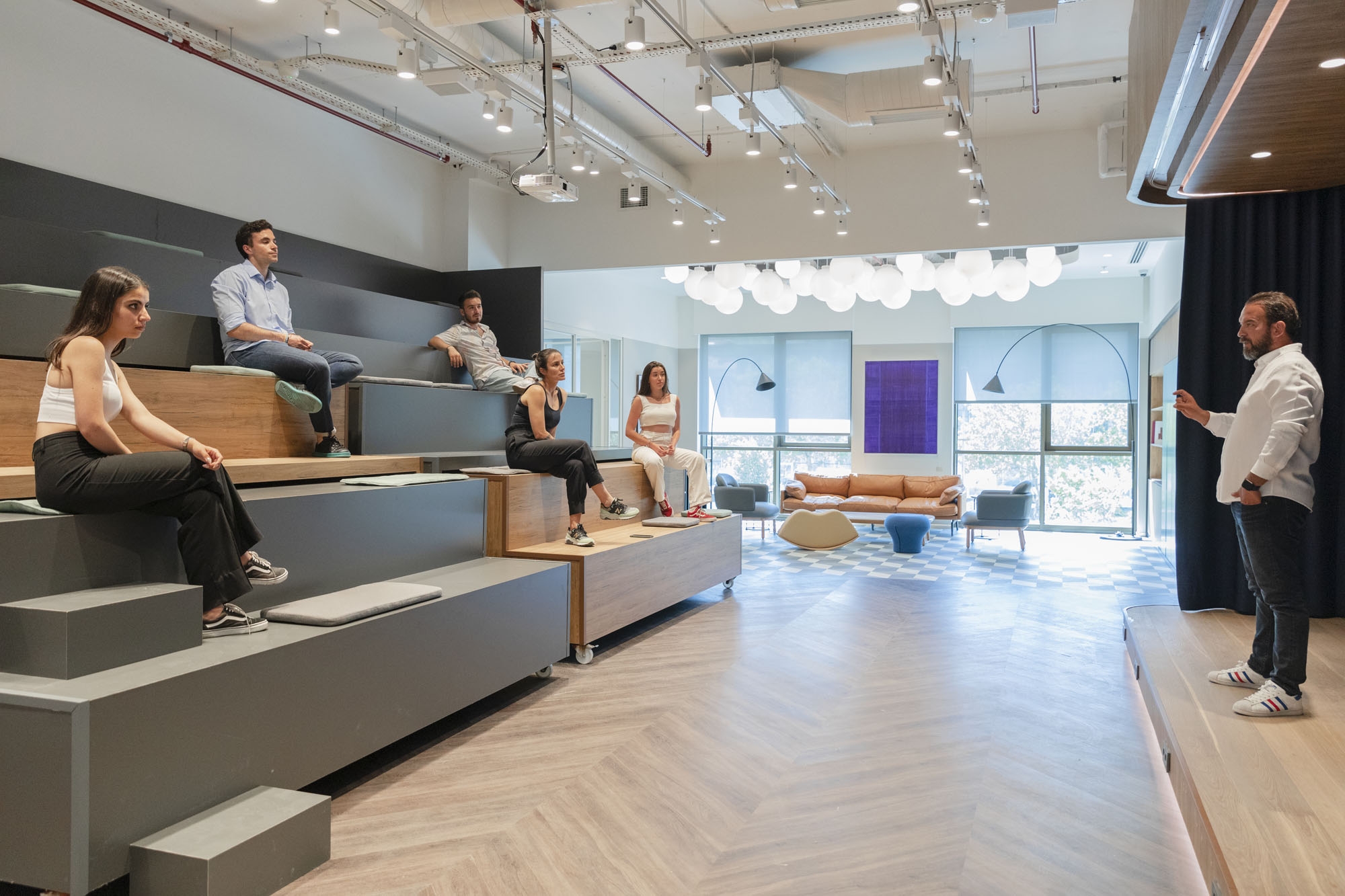 In the main circulation areas, custom-designed curvy lighting elements create a sense of flow and visual continuity across floors. The social area features a transformable amphitheater, which adapts throughout the day as a working and gathering space, while also functioning as a flexible stage for events, presentations, and community activities.