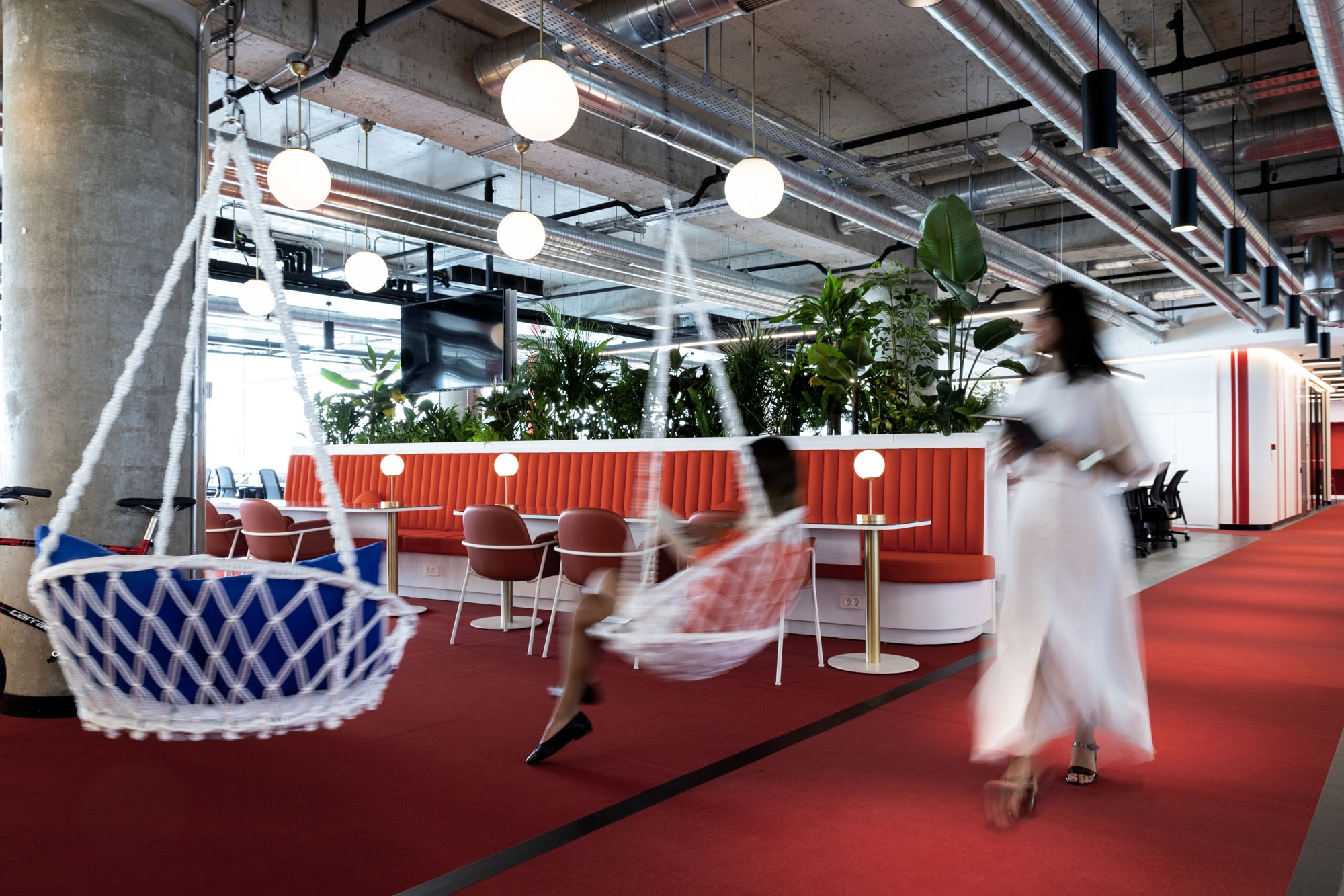 For a cheerful atmosphere, company color red is used as the main color supported by few accompanying colors at the shared spaces. With swinging chairs hanging from the ceiling, small areas suited for chatting, colorful and multiple kitchenettes, and playful seating areas; N11 office design is setting an informal tone as well as creating moments to rest and relax. More playful approach is created on the corridors with the help of a continuous red band circulating the floors of the office space.