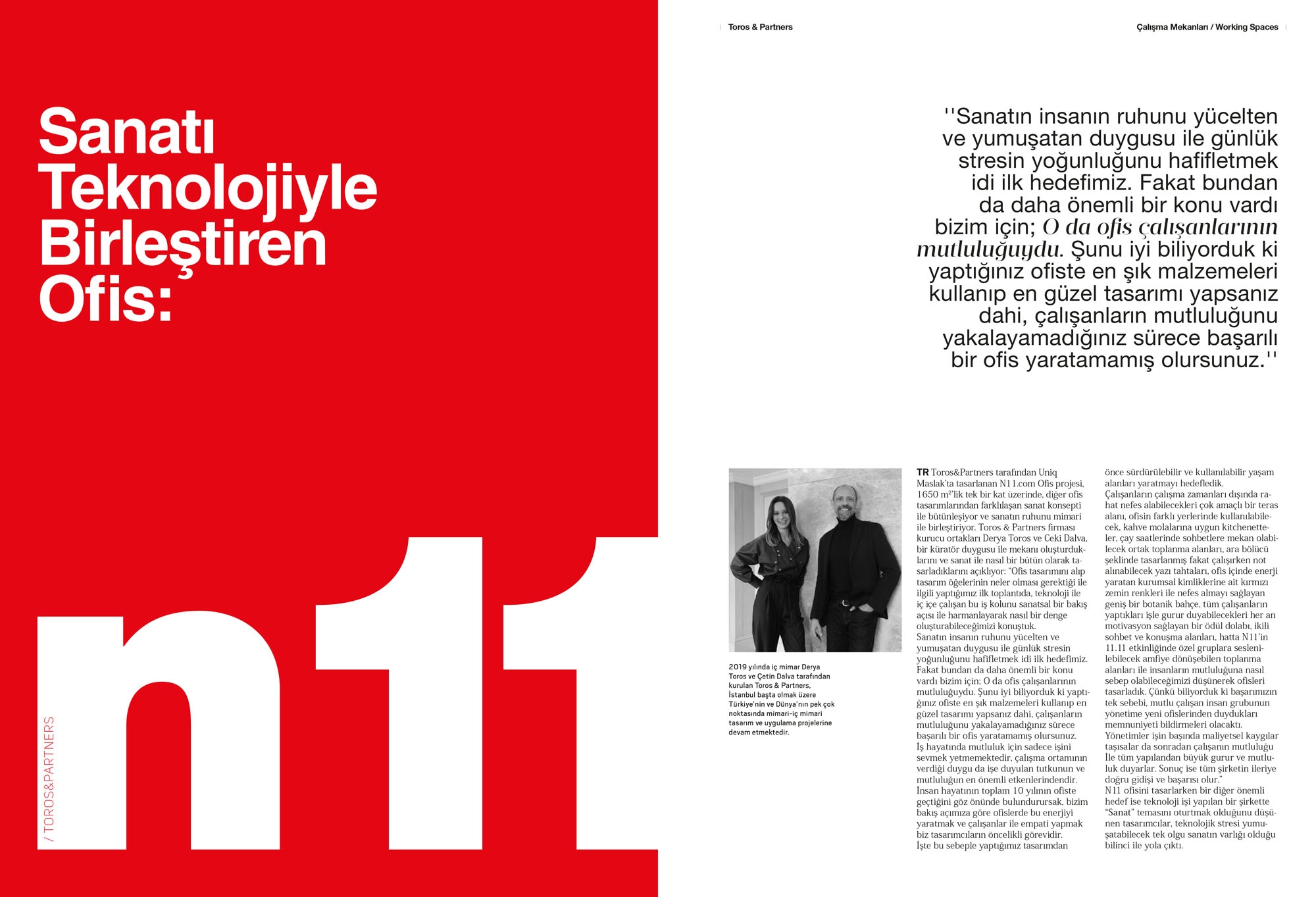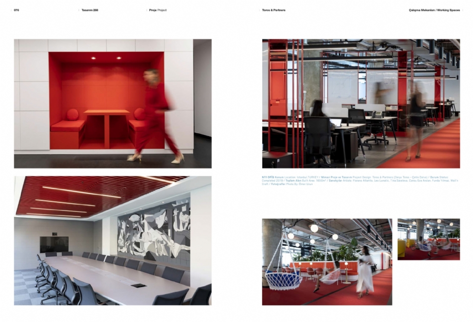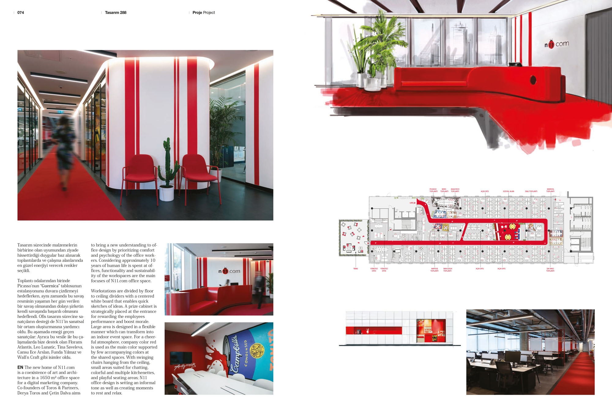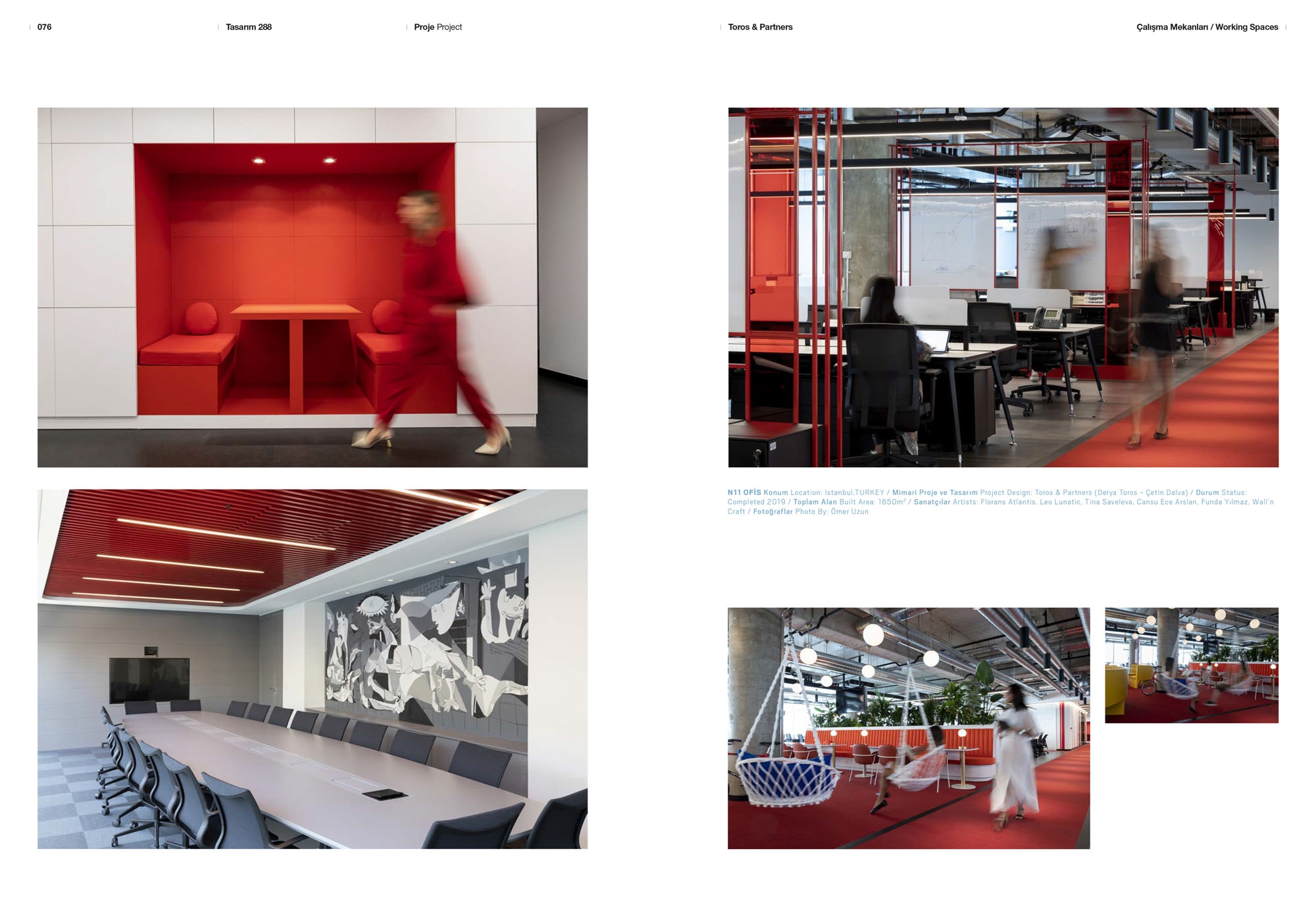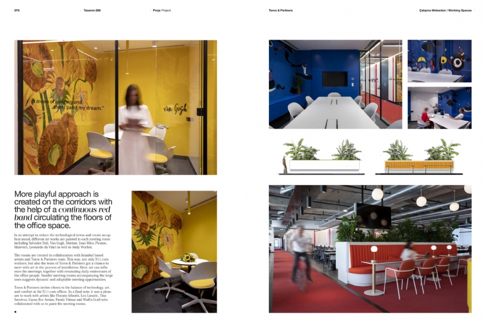 In collaboration with talented artists, Toros and Partners designed a unique 1650 m² office for N11.com that prioritizes both comfort and creativity. With dynamic meeting spaces and vibrant interiors, this project creates a modern and inspiring hub for the digital era. For more detailed information, you can explore Tasarım Dergisi’s 288th issue.