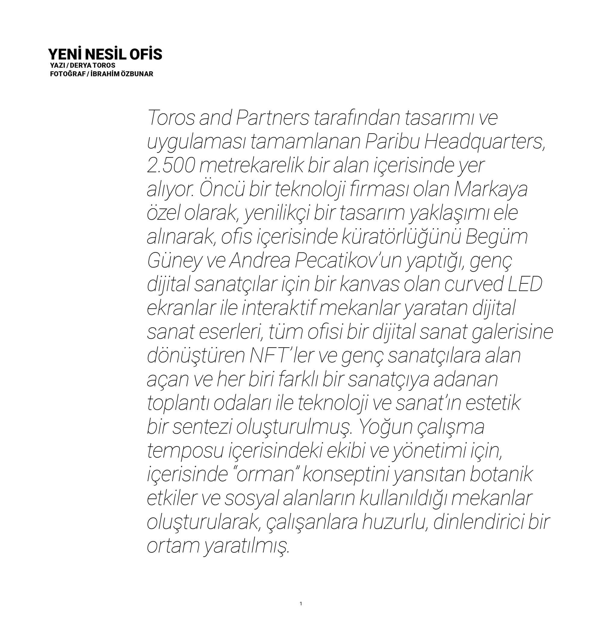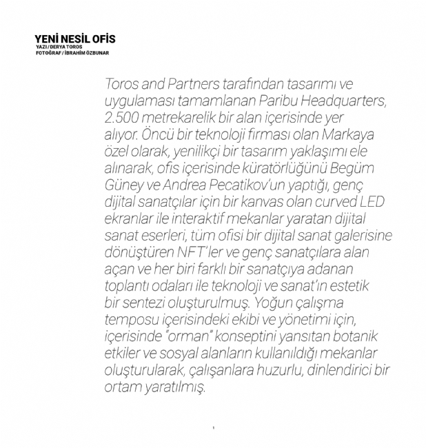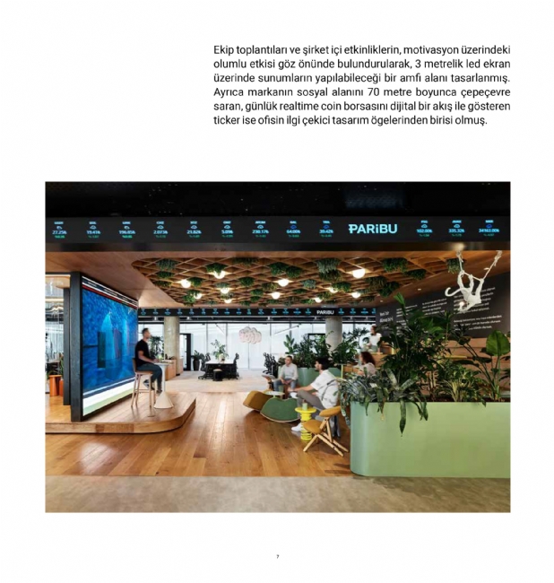 Toros and Partners recently showcased the new Paribu Headquarters in KUN Magazine, a space where technology, digital art, and nature merge seamlessly in 2,500m². With interactive LED screens, NFTs, and artist-inspired meeting rooms, the office promotes creativity and collaboration. The “Jungle” concept and modern social areas provide a refreshing atmosphere, reflecting Paribu’s dynamic spirit.