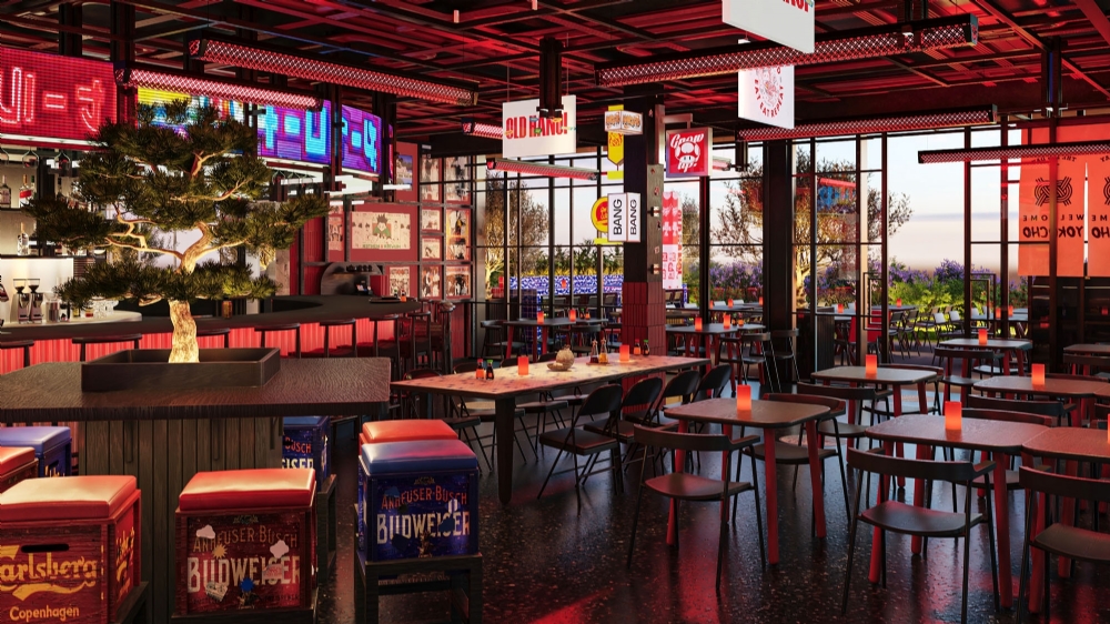 A balance of tradition and technology is achieved through digital screens integrated into the bar, adding a modern layer to the experience. The use of bonsai trees and natural elements softens the industrial aesthetic, bringing an organic touch to the urban street vibe.