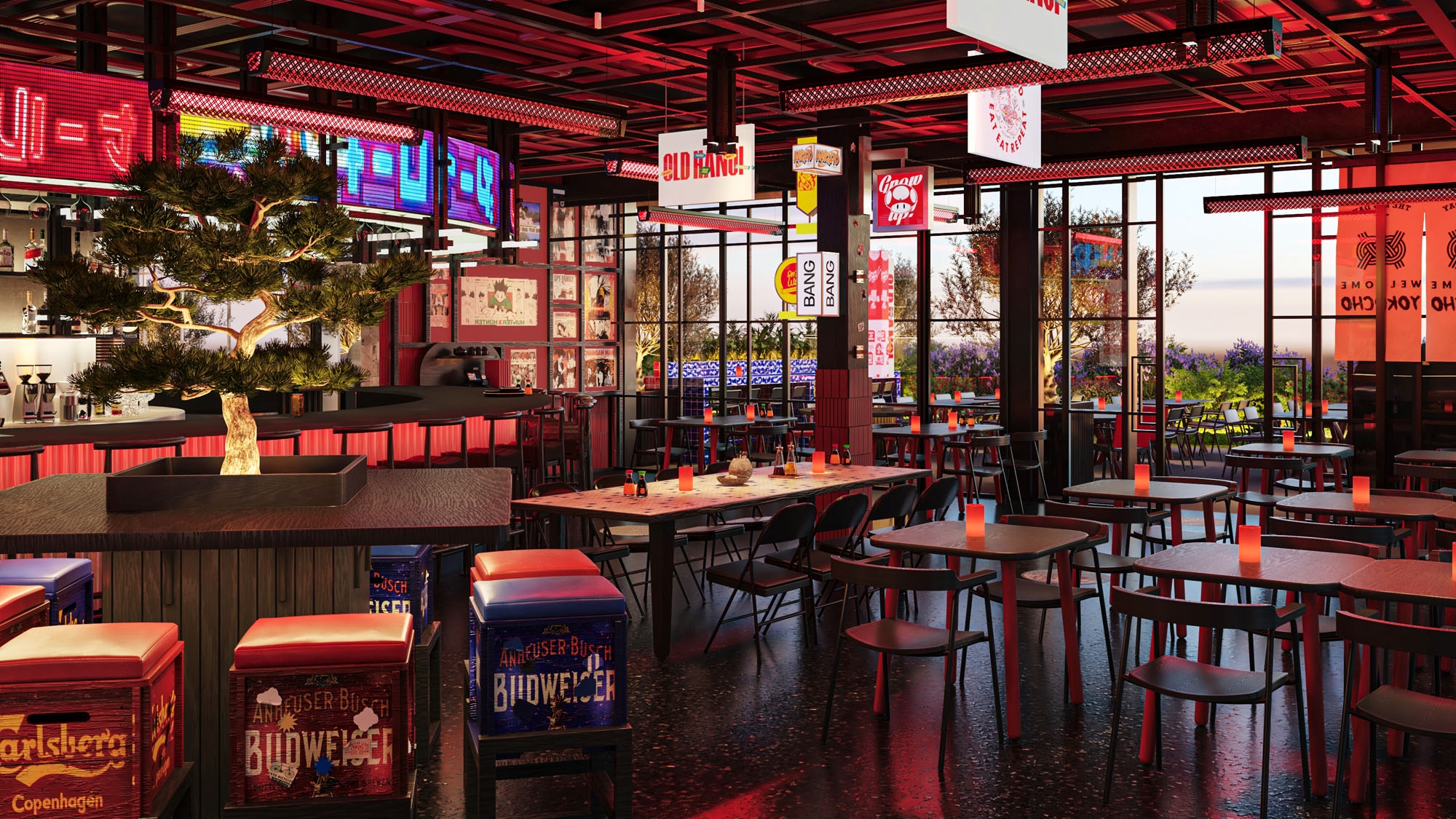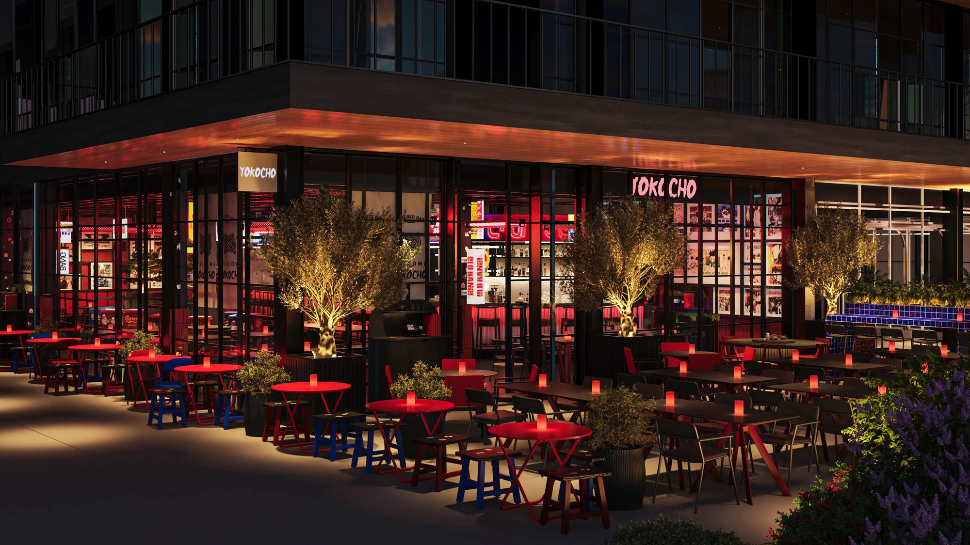 The exterior features bold red and blue tones, accented by black and red furniture, creating an inviting and energetic atmosphere. Vibrant ceramic surfaces echo the dynamic pulse of Asian streets, while the distinctive Yokocho logo—designed with varying fonts—draws the street culture directly into the space.