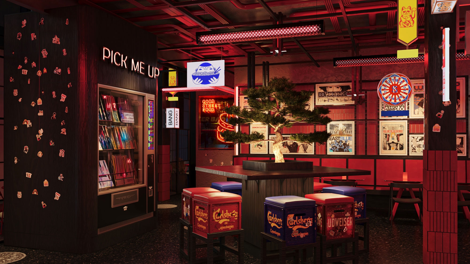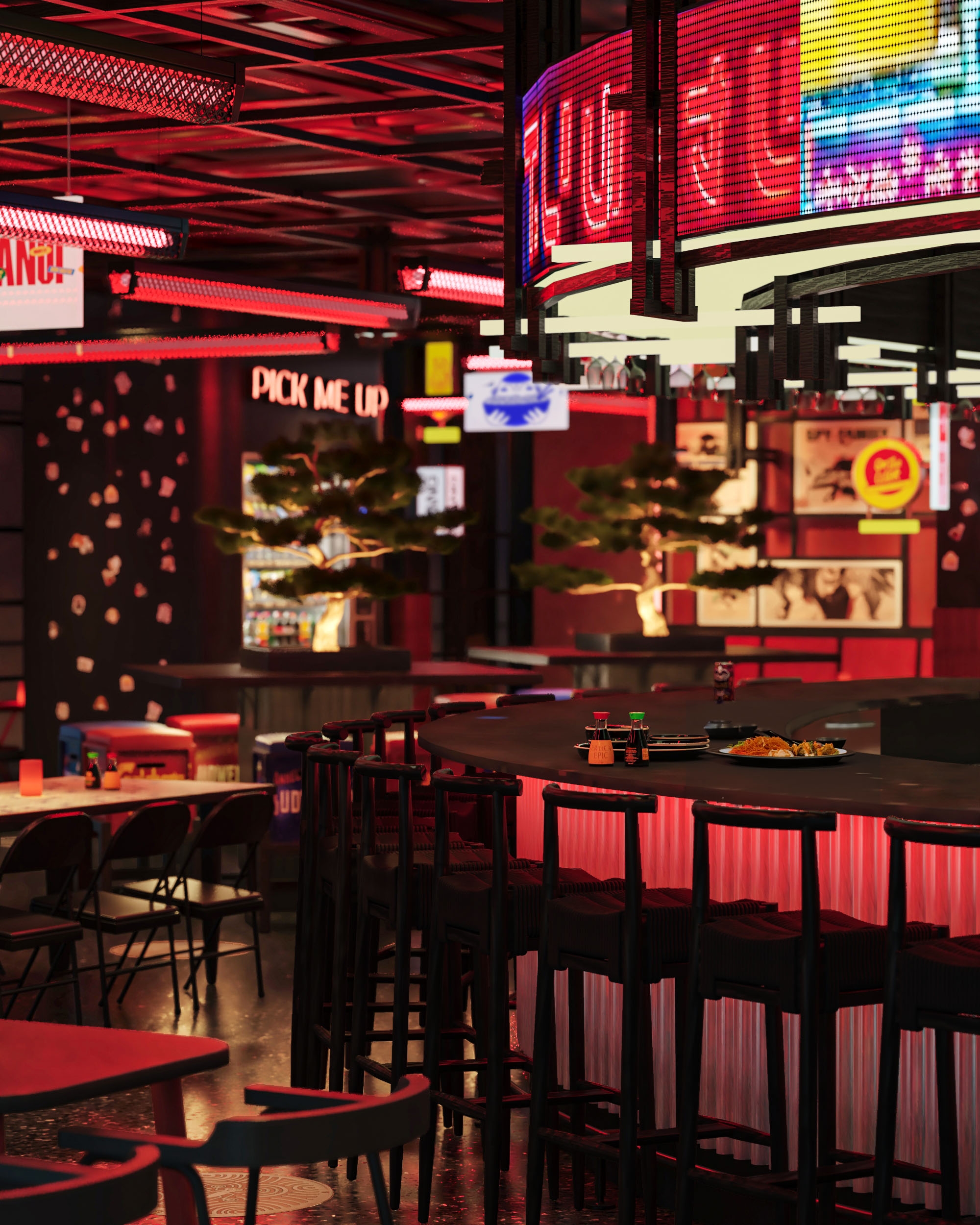 Inside, the design blends traditional Japanese aesthetics with modern elements. Inspired by Japanese tōrō lanterns, red lighting behind doorways enhances the warm ambiance, reinforcing the connection to Japanese culture. Industrial touches, wooden textures, and Asian-inspired posters further enrich the immersive experience. Seating arrangements encourage social interaction, while a music selection box and interactive elements amplify the street food concept.